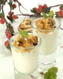 Une todo en un bol, sirve bien frio en copas, cuencos, etc.; adornado como quieras. Ponle al final la cucharadita de miel