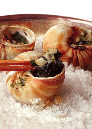 Cuando los caracoles se hayan enfriado, escúrrelos y ponlo en cada concha una pequeña porción de la mezcla de mantequilla y un caracol, cubriendo con más mantequilla. Coloca los caracoles preparados en una cazuelita e introdúcelos 5 minutos en el horno previamente calentado (220 °C). Sirve los caracoles en las cazuelitas, con un tenedor pequeño y una pinza por cada comensal.