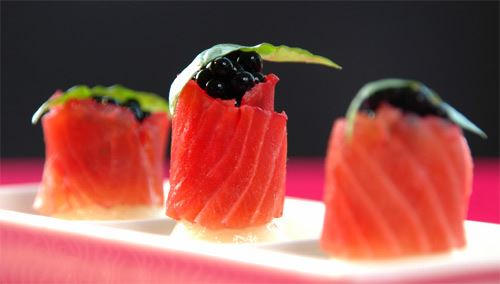 2. Cortar lomos de bonito con un grosor de 0’8 sal-pimentar, cubrir con la vinagreta e introducir en la nevera durante 1 hora.