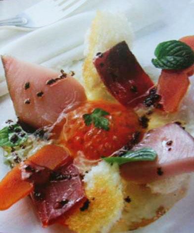 Cortar el queso en lonjas gruesas y colocar encima las lonchas (muy finas) de huevas de maruca.