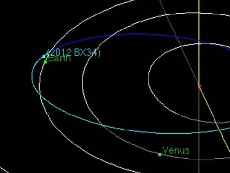 El asteroide «2012 BX34» pasará «sin peligro» a unos 59.044 kilómetros de la Tierra, o lo que es lo mismo, una distancia 0.17 veces lo que le separa de la Luna (que orbita a una distancia media de 384.500 kilómetros), indicaron a través de su cuenta de Twitter.