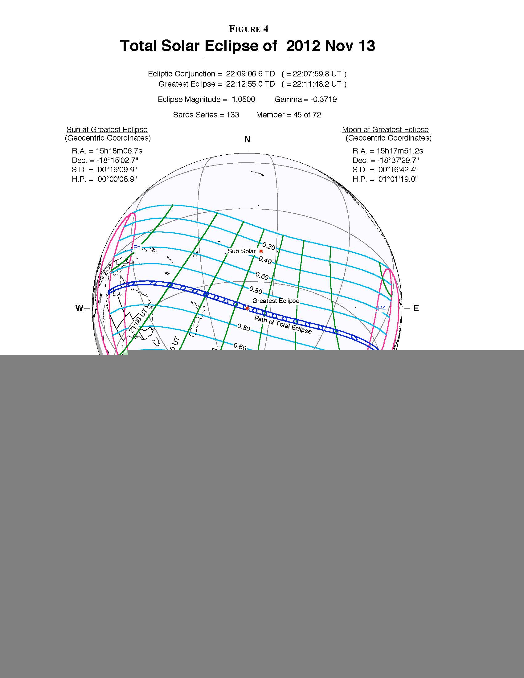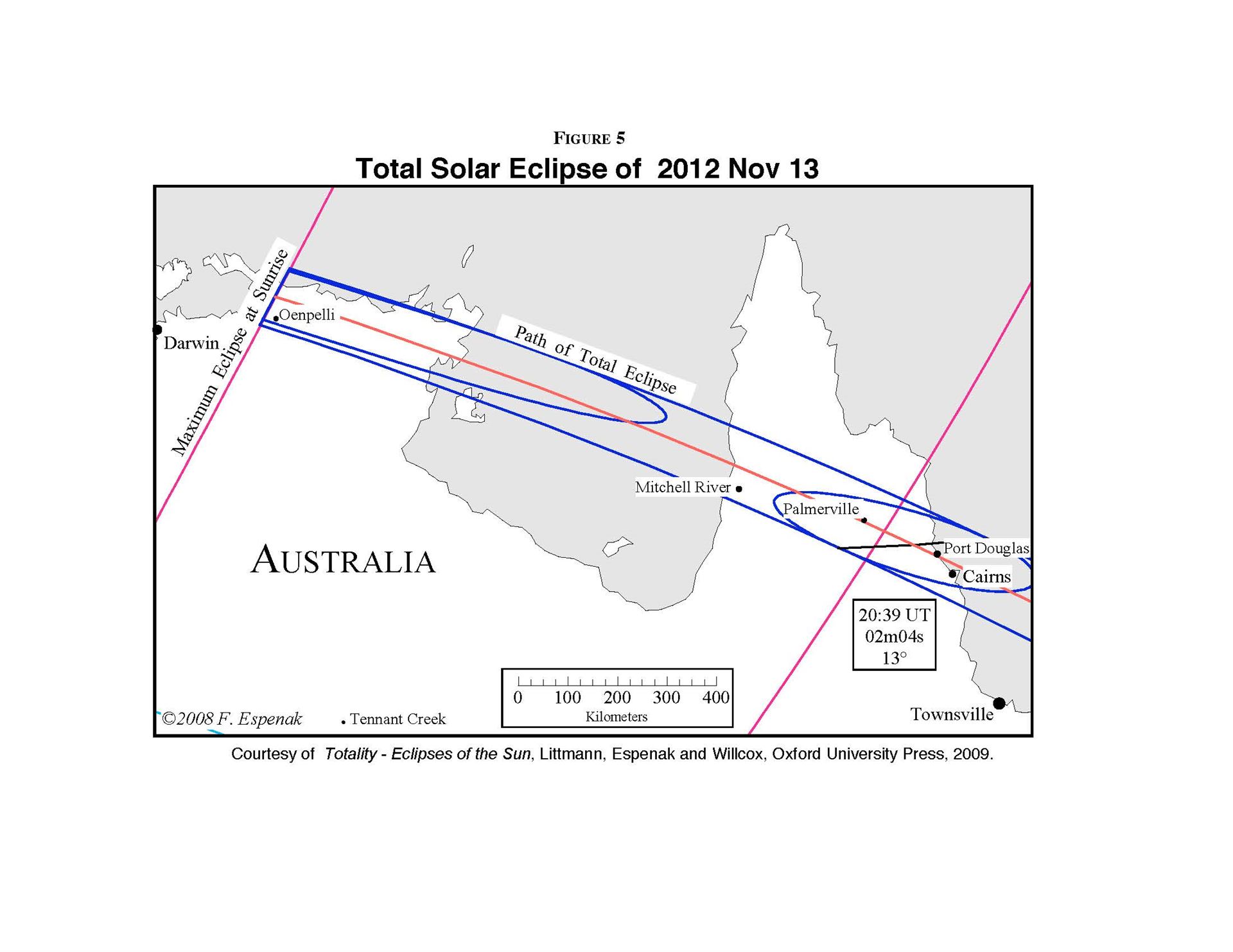 El eclipse total de sol de 2012 se produce en el nodo ascendente de la Luna en el centro de Libra. El camino de la sombra de la Luna cruza el Sur del Océano Pacífico, tocando tierra solo en el norte de Australia. La Sombra penumbral de la Luna, producirá un eclipse parcial visible desde una región mucho más grande que cubre el Pacífico Sur (incluyendo Australia y Nueva Zelanda), el sur de América del Sur, y parte de la Antártida (Figura 4).