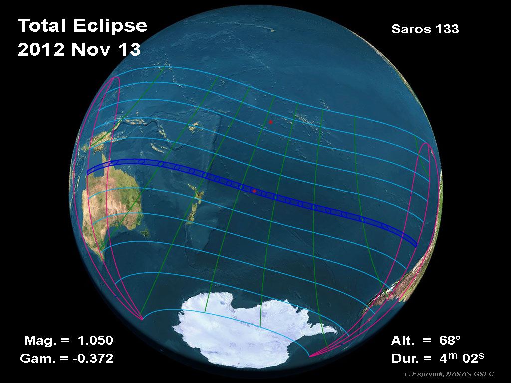 Entre el 13 y 14 de Noviembre del 2012, un eclipse total de Sol será visible dentro de un estrecho pasillo que atraviesa hemisferio sur de la Tierra. El camino de la sombra de la Luna comenzará en el norte de Australia y cruzará el Sur del Océano Pacífico sin tocar otro punto de la tierra. La Sombra penumbral de la Luna producirá un eclipse parcial visible desde una región mucho más grande que cubre Australia, Nueva Zelanda y el Pacífico del Sur o Sur Pacífico.