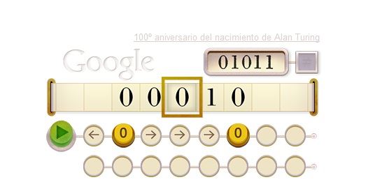 Este 23 de Junio, sería el centésimo cumpleaños (cien años) de Alan Turing, en su honor los creativos de Google han elaborado un divertido Doodle basado en una de sus ideas mas conocidas, la famosa máquina de Turing, El objetivo es programar las instrucciones necesarias para dar color al logo de Google, al hacer coincidir dos números binarios ( ceros «0» y unos «1»), utilizando las reglas y botones activos, te invitamos a probarlo. (en Google.com).