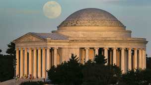 The full moon is seen as it rises near the Lincoln Memorial, 19 March 2011, in Washington D.C. This type of full moon is called a «Super Perigee Moon» since it is at it’s closest to Earth.