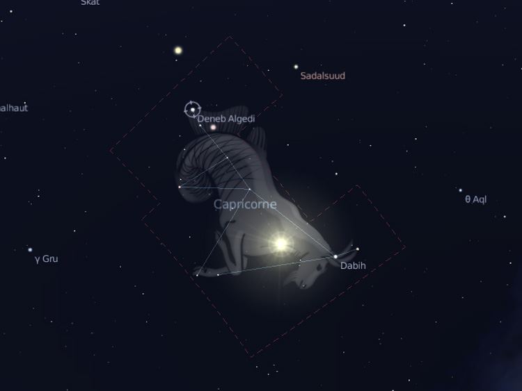 Se supone que Capricornio es una «cabra» -la cola de un pez conectada con la cabeza y el cuerpo de una cabra. Es una de varias constelaciones acuáticas en esta región del cielo, que se conoce como «el mar.» Y el «rey» del mar está pasando ahora por las fronteras de Capricornio: es el planeta Neptuno, llamado así por el dios romano del mar. Se necesita un telescopio y un buen mapa estelar para encontrarlo, cerca del extremo este de la constelación.