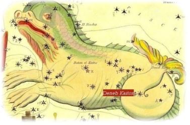denebDeneb Kaitos, la «cola de la ballena», nada a través del cielo sureño. La estrella moderadamente brillante forma la cola de Cetus, la ballena o monstruo marino. A las 9 p.m., se encuentra como a la mitad entre el horizonte del sur y el punto directamente por encima de la cabeza.