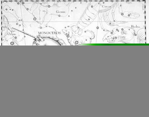 La débil constelación de Monoceros, el unicornio, asciende tarde por la noche, justo debajo de Orión, el cual es mucho más brillante. Está hacia la izquierda inferior del Cinturón de Orión, un línea corta de tres estrellas brillantes que asciende justo arriba del horizonte.