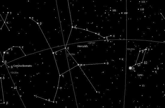 herculesA pesar que Herculis es una constelación grande, sus estrellas son tan débiles que usted necesitará cielos oscuros para verla. La luz guiadora del hombre fuerte es Kornephoros, «el cargador del garrote». Está cerca del extremo derecho de la constelación conforme Herculis asciende a la vista.