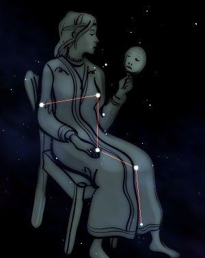 Casiopea, la reina, se encuentra alta en el noreste al caer la noche durante este mes. La constelación representa a una mujer sentada en un trono. Sin embargo, sus estrellas más brillantes se ven más bien como la letra M o W.