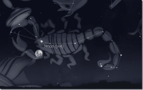 La Luna toca la cabeza del escorpión esta noche. Conforme la Luna asciende hoy tarde por la noche, las estrellas que delinean la cabeza del escorpión están a su izquierda inferior. La estrella más brillante del escorpión, la anaranjada Antares, está bastante por debajo de ellas.