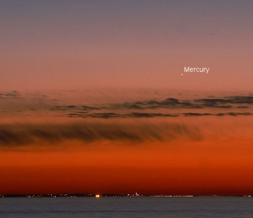 El planeta Mercurio se asoma a la vista como unos 30 o 40 minutos después de la puesta del Sol. Es brillante pero también está bastante bajo en el cielo, así que es difícil de ver en el crepúsculo. Cualquier edificio o árboles a lo largo del horizonte lo bloquearán de la vista.
