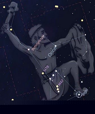 La más hermosa de todas las constelaciones se ve muy bien las tardes de invierno. Orión, el cazador, está en el sureste al anochecer y más tarde rueda por lo alto del sur.
