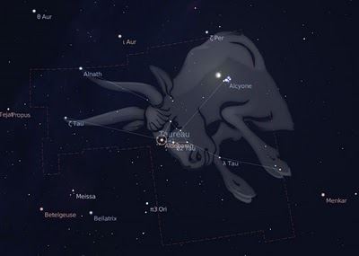 El torvo ojo de Tauro, el toro, nos mira sin parpadear desde lo alto del cielo esta noche: es la anaranjada estrella Aldebarán. Es una de las estrellas más brillantes de la noche, y nos proporciona una ojeada al destino de nuestra estrella, el Sol.
