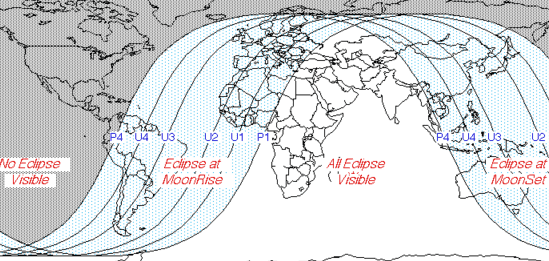 Todo el evento se verá en la mitad oriental de África, Oriente Medio, Asia central y el oeste de Australia. Los observadores de toda Europa se perderan las primeras fases del eclipse, ya que se producen antes de salida de la luna. Afortunadamente, la totalidad se verá en todo el continente, excepto en el norte de Escocia y el norte de Escandinavia. Asia oriental, el este de Australia y Nueva Zelanda se perderan las últimas fases del eclipse, ya que se producen después de la puesta de la luna. Una vez más, la fase total se verá en la mayoría de estas regiones. Incluso los observadores en el este de Brasil, Uruguay y Argentina serán testigos de la totalidad. Sin embargo, ninguno de los eclipse será visible desde América del Norte. En la mitad del eclipse, la Luna está cerca del cenit de observadores de las islas Reunión y Mauricio.