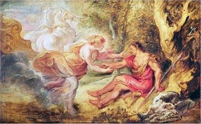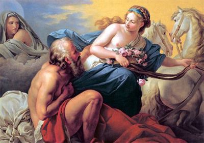 Justo antes del amanecer llega la mensajera del Sol, una joven muy bella vestida de azafrán. Eos (en latín Aurora), la diosa del alba roja cabalgaba por el cielo en un carro tirado por dos rápidos caballos (Lampo y Faetón).