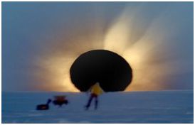 EclipseUna salida del Sol totalmente eclipsada en la Antártida.